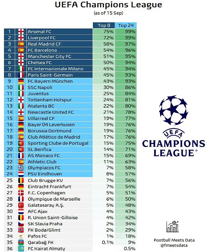 Любопытно, что Football Meets Data не видит «Баварию» в топ-8.