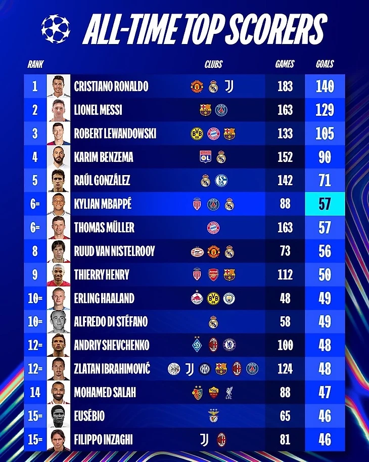 Дубль Килиана Мбаппе стал 56-м и 57-м голами француза в ЛЧ. Теперь он в топ-6 бомбардиров за всю историю турнира.