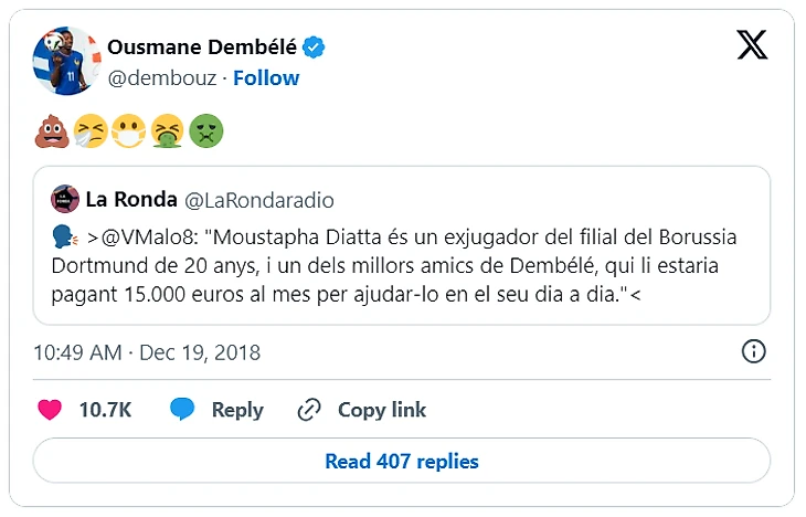 В ответ на это Дембеле выдал серию презрительных эмодзи в твиттере.