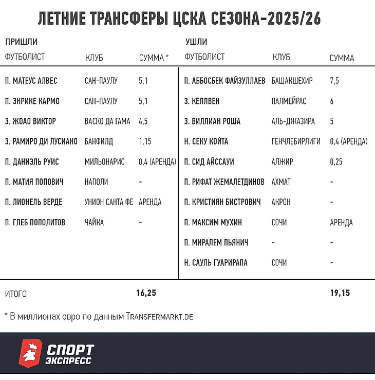 ЦСКА сильно реформировал состав в межсезонье. В летнее трансферное окно клуб после ухода главного тренера Марко Николича покинули Кристиан Бистрович, Рифат Жемалетдинов, Миралем Пьянич и Аббосбек Файзуллаев (за 7,5 миллиона евро в «Башакшехир» — здесь и далее все цены по данным Transfermarkt). Чуть позднее случился неожиданный оффер от «Аль-Джазиры» на 5 миллионов евро по Виллиану Роше, который в ЦСКА приняли. А еще вернулся на родину другой бразилец — Келлвен, который очутился в бразильском «Палмейрасе» за 6 миллионов евро. Плюсом — аренда Сейду Койта в «Генчлербирлиги» из Турции, причем аренда платная — 400 тысяч евро.