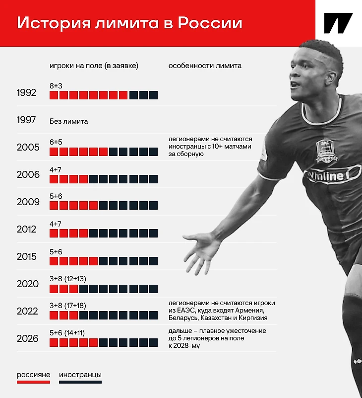 Актуальный лимит (3+8) – один из самых мягких в российском футболе. Уже со следующего сезона его сильно ужесточат.