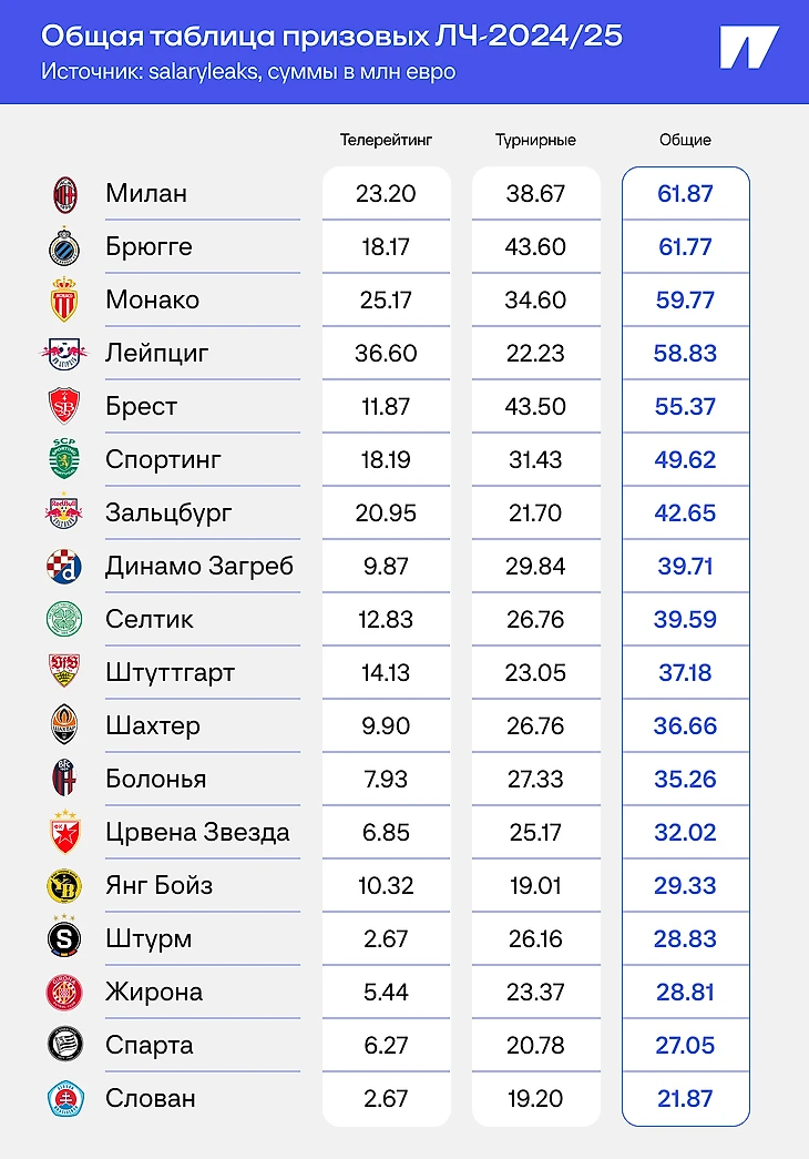 «Лейпциг» (58,83 млн) с одной победой и общей 32-й позицией заработал больше вышедших в раунд плей-офф «Спортинга» (49,62 млн) и «Бреста» (55,37 млн). «Янг Бойз» с нулем за весь турнир и последним местом – по деньгам оказался выше «Спарты» (29,33 млн против 27,05 млн).