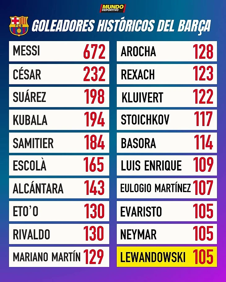 Кроме этого, по данным Mundo Deportivo, теперь поляк входит в элитный бомбардирский клуб «блауграны», пока заняв в нем двадцатое место со 105 забитыми голами. Делит он эту позицию с бразильцами Эваристо и Неймаром.