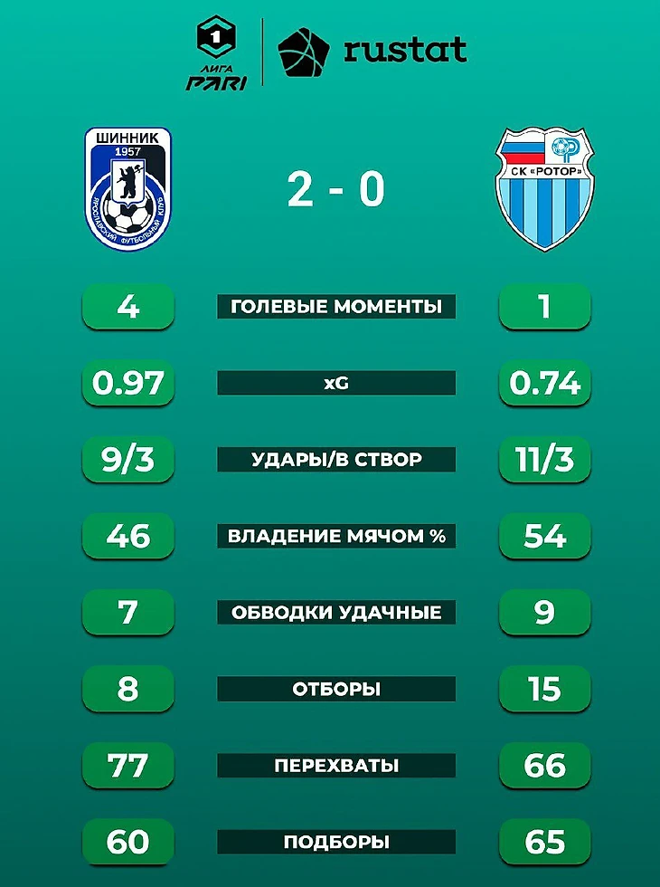 4. Команда Артема Булойчика продолжает свою беспроигрышную серию в абсолютно «энергосберегающем» режиме. Показатель xG «Шинника» вновь не достиг единицы, однако на табло 2:0. Продолжается и «сухая» серия молодого голкипера Тимофея Митрова. В игре с «Ротором» он сделал весьма впечатляющий прыжок, спасая ворота после дальнего «выстрела» Кайнова. А с более близкой дистанции опасно бить не позволяла бить защита ярославской команды, понемногу перехватывающая титул главной «волжской защепки» у «Ротора». В целом, «Шинник» уже не выглядит претендентом на борьбу за выживание, но и для чего-то большего, чем середина таблицы, пока нет особых оснований.