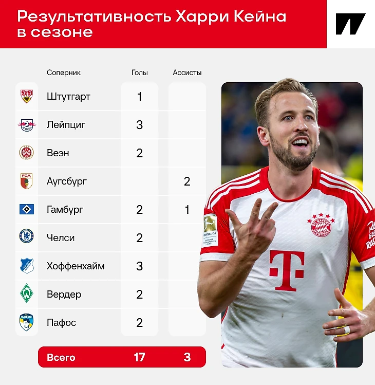 Это третий сезон Кейна в «Баварии». На таком же отрезке в девять матчей во всех клубных турнирах в прошлом и позапрошлом годах были примерно одинаковые показатели. Кейн тогда отдавал по четыре ассиста, забивая девять голов в 2023-м (четыре с пенальти) и десять в 2024-м (пять с пенальти).