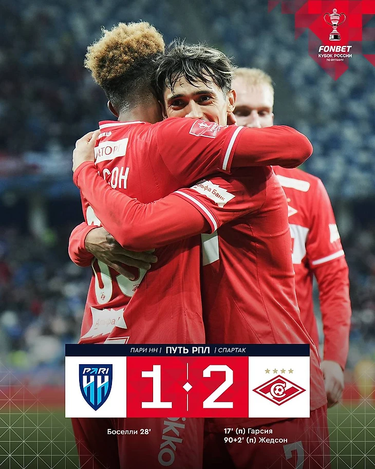 «Спартак» вырвал победу над «Пари НН» в Кубке России благодаря голу Жедсона в концовке