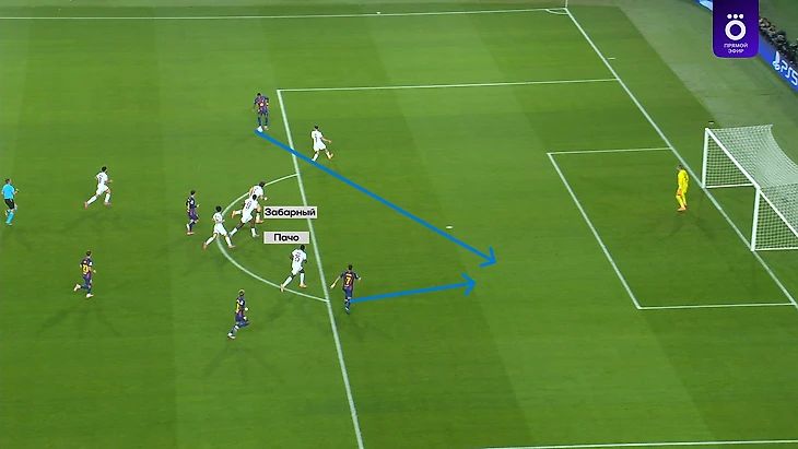После еще 2-х замен от Энрике аткакующий потенциал гостей снова начал дрейфовать в сторону левого фланга. Возникали даже такие рискованные перегрузы: