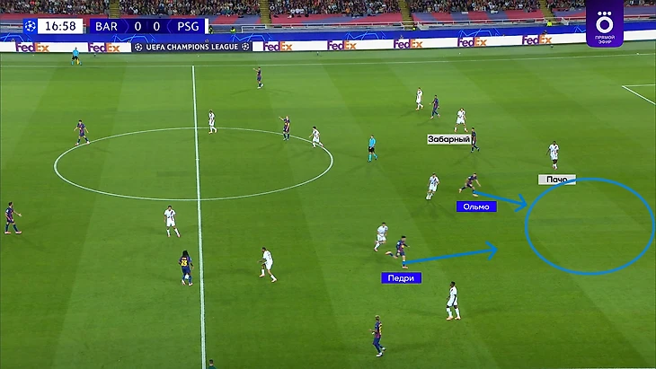 Гол «Барселоны» так же пришел из позиционной путаницы защитников «Парижа». Здесь они не поделили Педри и Феррана, оказавшись в слишком узкой позиции, и Торрес открыл счет.