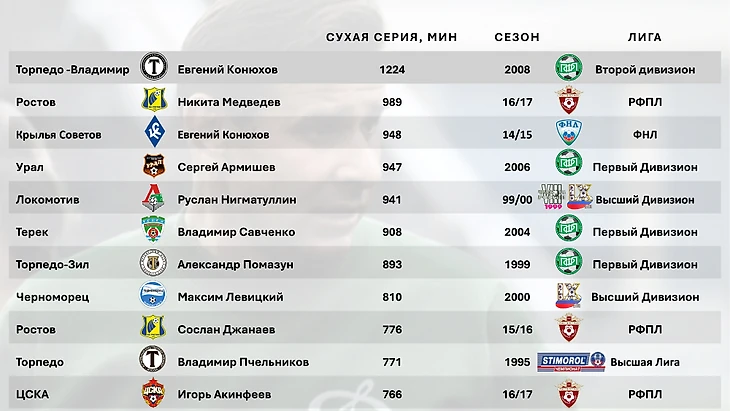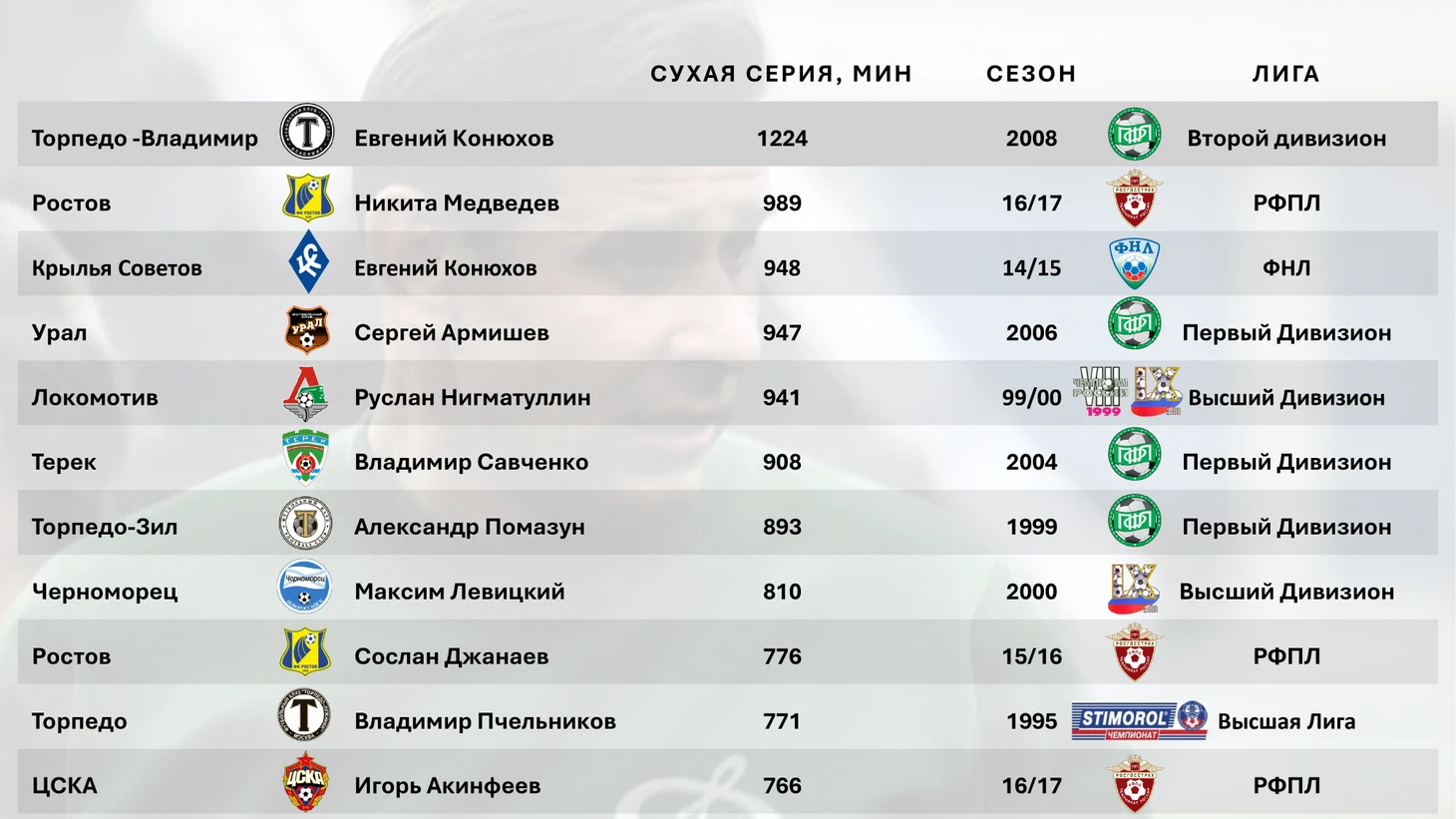 Серия Евгения Конюхова сильно выделяется, а если к ней добавить матчи Кубка России, выйдут космические 1404 минуты, да и в топ-3 есть другая серия этого вратаря, но уже в ФНЛ и спустя 7 лет после серии в ПФЛ.