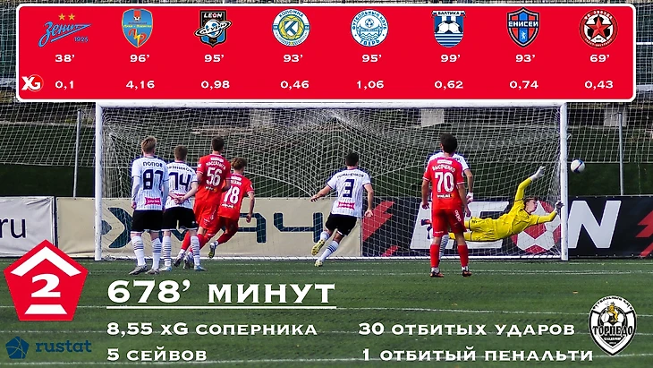 Наши догадки подтвердились, Андрей с запасом почти в 100 минут расположился в лидерах и какое-то время будет являться рекордсменом «сухой серии» в розыгрышах Второй лиги Б. Какие игры уместились в эту серию и какое влияние оказал Андрей, можно увидеть на подготовленной инфографике. Особняком в этой серии стоит матч против Великих Лук, где вратарь сохранил ворота сухими при xG соперника 4,16, в том числе отразил пенальти, как и в матче первого круга.