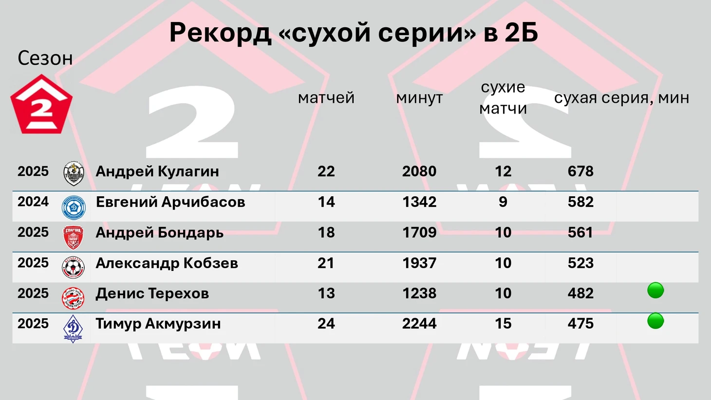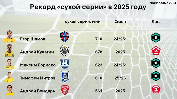 В списке пяти самых длинных «сухих» серий три из ФНЛ и две из 2Б, наш Андрей занял почетную вторую строчку, уступив только Егору Шамову («Енисей»), который выдал крутой перформанс на стыке 2024 и 2025 года. Отмечу Максима Бориско («Балтика»), который помимо серии в 623 минуты в ФНЛ 24/25, также сохранял свои ворота «сухими» 501 минуту в текущем розыгрыше РПЛ — второй показатель. На первом же месте в РПЛ расположился Денис Адамов («Зенит») с 531 минутой в текущем розыгрыше турнира. Рустам Ятимов из «Ростова» имеет текущую серию, которая сейчас насчитывает 443 минуты.