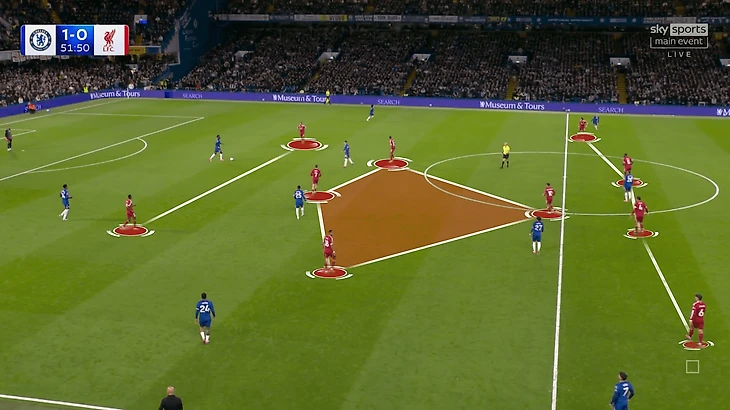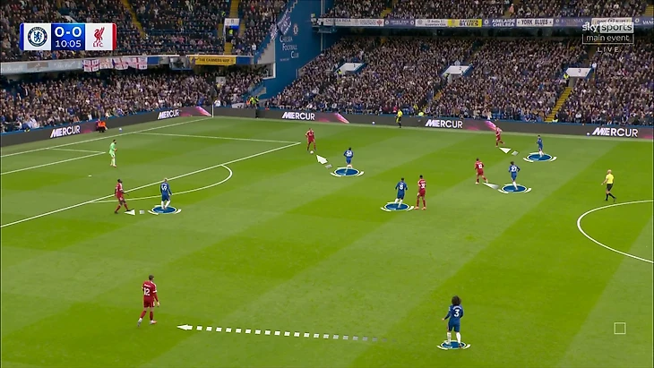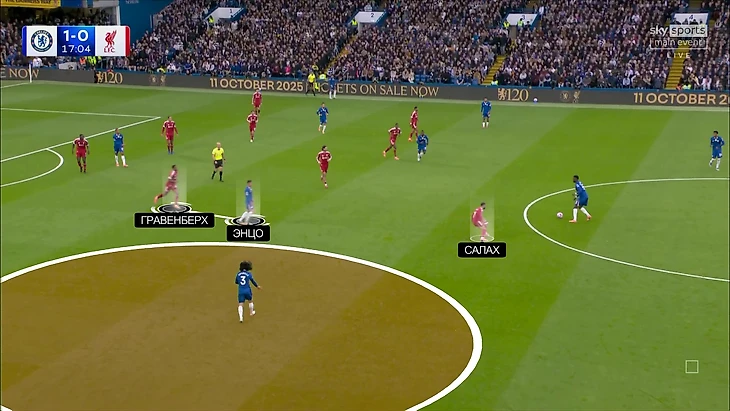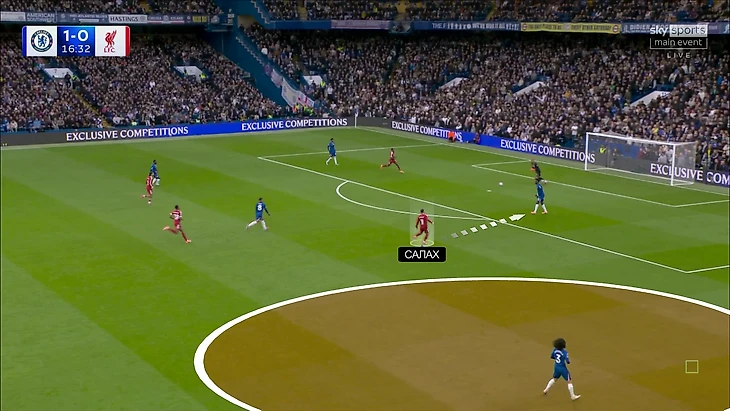 Более высокая позиция и свободная роль Салаха – частый прием «Ливерпуля». Он может окупаться за счет пользы в быстрых атаках, но большую часть конкретной встречи баланс плюсов и минусов был в пользу «Челси». Во-первых, подстраховка работала хуже обычного из-за опасения оставить свободным Энцо с его рывками до штрафной. Во-вторых, «Челси» осознанно, а не ситуативно, бил в зону на фланге Салаха.