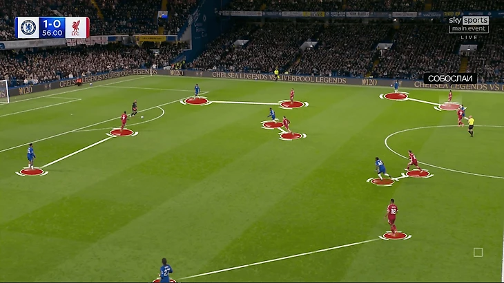 Обратная сторона персонального прессинга – опасные соотношение против индивидуально сильных игроков сзади. При дальних передачах оставалось 3-в-3 на пространстве. От «Ливерпуля» была тройка Салах-Исак-Гакпо: