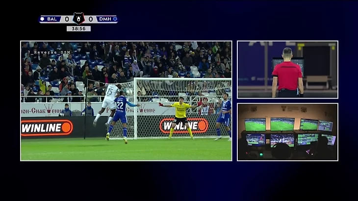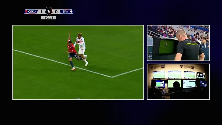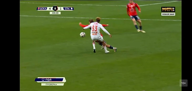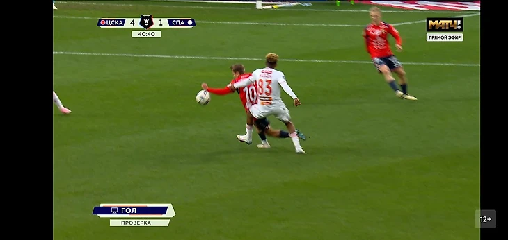 .Учитывая первый скрин, понятно почему ВАР позвал судью к монитору - Чистяков просто не видел момент контакта. Так что это не был случай определения географии, когда судью в поле не зовут, Чистяков зафиксировал другой фол, а не тот, что привел к пенальти. Хотя конечно сам пенальти - нелогичный и обидный для КБ - воротам то никакой угрозы не было, игрок вообще выходил из штрафной. Но что поделать - а РПЛ такие пенальти ставят постоянно, не далее как в 9 туре в ворота Оренбурга назначили такой же, в игре с Динамо Мск. Но на этом неприятности гостей не закончились - после реализованного Обляковым пенальти ЦСКА на 17 минуте забил еще раз. Еще один россиянин из атакующей группы ЦСКА - Круговой - отличился тонким подставлением ноги под пас - прострел того же Аллерандро, поймав Максименко на противоходе. Правда через 3 минуты один гол гости отыграли - виновник пенальти Жедсон подключился на дальнюю штангу при угловом и почти внес мяч в ворота. А еще через 3 минуты уже Алвес бил по пустым воротам из-за штрафной, но защитник мяч зацепил и тот по плавной дуге опускался в ворота, куда успел вернуться Максименко. Самый однако важный момент с точки зрения судьи случился на 38 минуте игры, когда после очередной быстрой атаки ЦСКА Круговой забил четвертый мяч. ВАР его смотрел очень долго из -за контакта мяча с рукой Облякова в начале атаки: