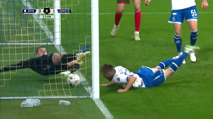 Скрин сделан в момент уже после сейва Митрюшкина, но это специально - именно в этот момент мяч касается газона, и даже «на глаз» видно, что от точки контакта мяча с землей до линии ворот расстояние больше, чем радиус мяча. Чуть больше, чем через 2 минуты Сергеев решает сам уже судьбу не испытывать - отдает пас на Бителло, и тот выводит Динамо вперед ударом с 7 метров. После гола минут на десять моменты у ворот Локомотива возникать перестают, но на 35 минуте Бителло «перенимает эстафету» от Сергеева, попав в защитника примерно с 8 метров. а затем в очередном быстром наскоке Локо происходит контакт Руденко с Касересом