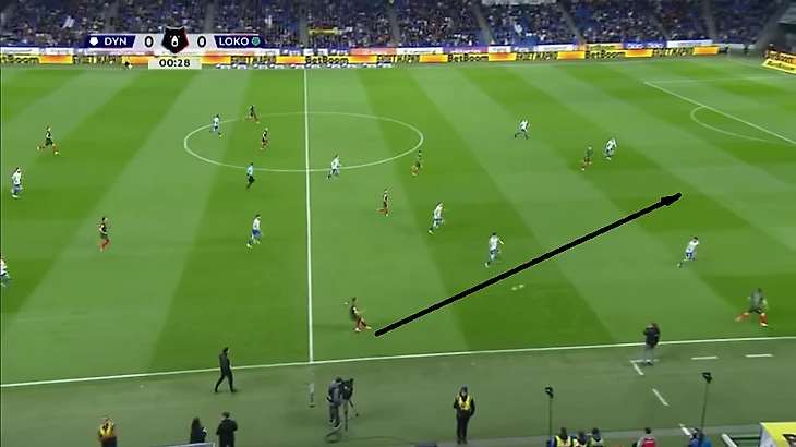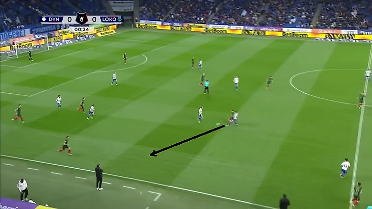 Обратите внимание на игроков Динамо - их 9 на чужой половине, когда мяч уже в продвинут игроками соперника до 12 ярдов от центра поля. Продолжение идет переводом в свободную зону в центр на игрока атаки