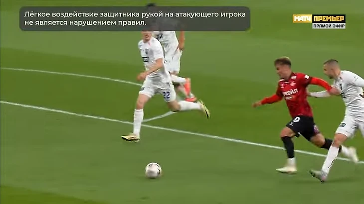 - двумя вытянутыми вперед руками судья показал, что применяет принцип преимущества, не останавливая игру. Другими словами он видит попытку срыва перспективной атаки. Не будем оценивать, попал мяч в руку случайно или Обляков сыграл рукой осознанно, хотя еще прошлой осенью в игре Ахмат - Химки гол после отскока от руки Садыгова засчитали на том основании, что забит тот был не сразу. Вопрос в другом - почему при возобновлении игры был назначен штрафной в пользу Спартака, и не вынесены дисциплинарные санкции игроку Спартака? Ведь очевидно - не пытайся Жедсон остановить соперника с нарушением, Обляков мяча рукой мог бы и не коснуться. Похоже ДСИ РФС со своим увлечением понятием АРР (attacking phase of play), которое вообще-то в Правилах отсутствует, довел ситуацию до полного абсурда: ВАР - ассистент по своему желанию, без всякого основания с точки зрения Правил, может либо засчитать гол, как Казарцев сделал за 2 часа до этого, либо отменить, как в этой игре сделал Мешков. А между тем, понятие АРР нигде точно не описано, есть лишь 1 упоминание о нем в разделе 4.Процедура Протокола ВАР. При том, что понятие «Явная и очевидная ошибка» как основание для вмешательства ВАР в игру,записано во всех разделах Протокола - с него собственно Протокол ВАР и начинается на IFAB Board. Но понятие «явной и очевидно ошибки» полностью игнорируется в РПЛ.Вот ведь интересно - одно из дополнений главнее для ДСИ РФС, чем само правило. И просто для справки - в этом сезоне пока был всего 1 случай отмены гола за фол в атакующей фазе атаки за пределами РПЛ - в 1 туре АПЛ (хотя вообще о всех лигах говорить не могу - регулярно кроме РПЛ и АПЛ смотрю только отдельные игры Серии А). И отмена гола PGMOL там принята необоснованной именно по причине «не явной и очевидной ошибки». А в РПЛ такое происходило уже больше 5 раз точно в этом сезоне.