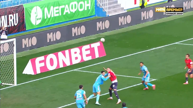Обороняющийся игрок держит соперника 2 руками, атакующий - одной, а мяч летит где-то вверху и в сторону. Ну это скорее просто о том, что никакого пенальти в ворота Махачкалы назначать было нельзя, тем более - после вмешательства ВАР. Но все же до конца первого тайма Акрон счет сравнял - на 35 минуте после кросса с фланга Сантос попытался сыграть головой на опережение и выбить мяч, но тот после рикошета от боровшегося с ним Севикяна в дальний угол ворот таки спланировал. Второй тайм начался вроде опять атаками Зенита, но до реально голевых шансов дело не дошло. Зато к концу игры у хозяев опять начали получаться моменты после кроссов в штрафную. И если гол, забитый на 88 мин. оказался не легитимным из-за «вне игры», то на первой добавленной после кросса и попытки удара Беншимола мяч попал в выставленную не то что в сторону, а просто на уровень плеча, руку Сантоса