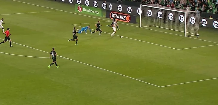 Спокойный матч сменился огненным: Краснодар принимал Ахмат, с четвертого тура не знавший поражений после прихода Черчесова. И уже на первой минуте Мелкадзе должен был забивать, но не попал в ворота из вратарской. Через минуту Касинтура пробивал почти с одиннадцатиметровой отметки, но его удар приняли на себя защитники. Краснодар никак не мог перехватить инициативу, но помогло необычное решение Кордобы - он решился на дальний удар с xG всего 0,02 на 14 минуте, и Шелия пропустил между поднятых рук. Но гости не сдавались, и через десяток минут Мелкадзе не использовал «момент тура» - обычно мы приводим скрины только судейских моментов, но как можно не забить отсюда?