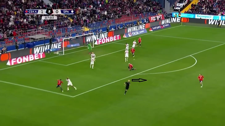 а когда обернулся - увидел только задержку рукой от спартаковца и назначил штрафной. Но, как заметил ВАР Мешков, еще до этого был контакт ногами между ними, который случился еще в штрафной Спартака