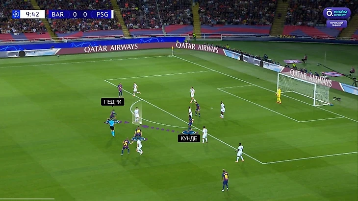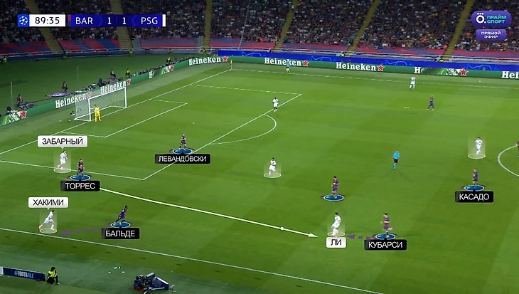 С проблемами в организации «блауграны» без мяча связан и победный гол «ПСЖ». Начало эпизода: «Барса» прессингует парижан: Торрес играет по Забарному, Бальде выдвигается на Хакими, а Кубарси глубоко выдвигается за Ли Кан Ином – именно на него идет пас Забарного: