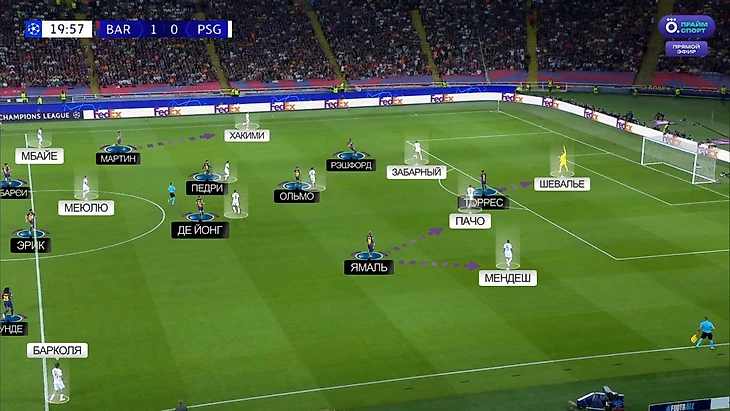 Рецепт успеха для команд в этом противостоянии – забрать мяч. В первые полчаса «Барселоне» удалось этого добиться – 57% времени она играла с мячом. Ключевая причина – прессинг каталонцев, который заставил «ПСЖ» часто отказываться от коротких розыгрышей. Это давление было довольно интересно организовано: Рэшфорд располагался в одной линии с Торресом, при этом Ферран проделывал двойную работу, переключаясь между Пачо и Шевалье. Ямаль занимал более выжидательную позицию чуть глубже – готов был чуть что выдвигаться на Пачо или Мендеша:
