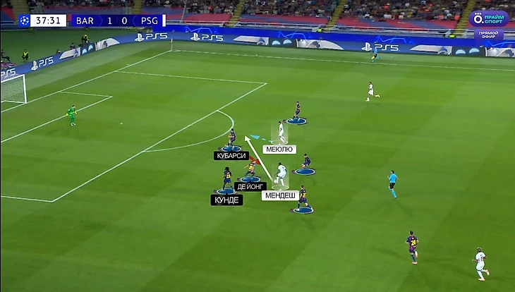 Это дало Нуну Мендешу необходимую свободу для того, чтобы сыграть в стенку с Мбайе и снова помчаться в свой фирменный прорыв. Здесь прессинг «Барсы» уже трещал по швам – Мбайе глубоко «вытащил» Эрика Гарсию на фланг и того страховал Френки де Йонг, у которого уже была желтая карточка: