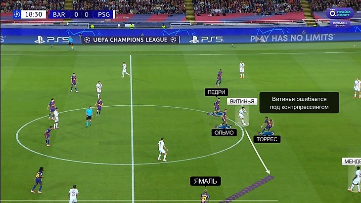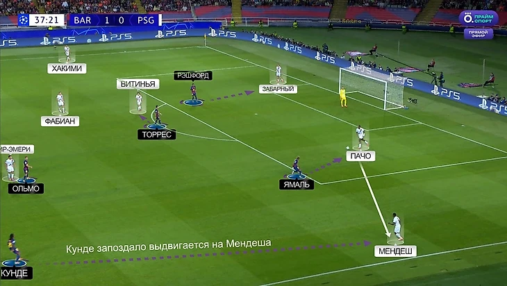 Мендеш сначала предупредил «Барселону» своим прорывом, а потом наказал. Интересно, что в моменте с первым голом «ПСЖ» у команды Флика проявилась проблема, которая потом подсветится ярче – запутанность и несогласованность в прессинге на правом фланге. Изначально «Барса» расположилась классическим для этого матча способом: Торрес и Рэшфорд давят на ЦЗ, Ольмо играет по Витинье, а Ямаль готов давить на Мендеша: