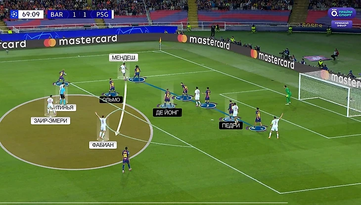 На другом фланге «ПСЖ» использовал уникальные качества Нуну Мендеша – из-за своей невероятной резкости и скорости португалец может просто пойти в прорыв со своей половины поля. Вот, например, эпизод, в котором Мендеш просто пронесся мимо Ямаля, Ольмо и Педри, а остановить его смог только Френки де Йонг, грубо нарушив правила и получив за это желтую карточку: