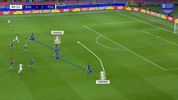 Хакими в итоге и сделает голевой пас на Гонсалу Рамуша. Португалец здесь воспользовался эффективным приемом против высокой линии Флика – изначально находился в огромном офсайде, чтобы при переводе мяча на фланг этот офсайд превратился в фору перед защитниками: