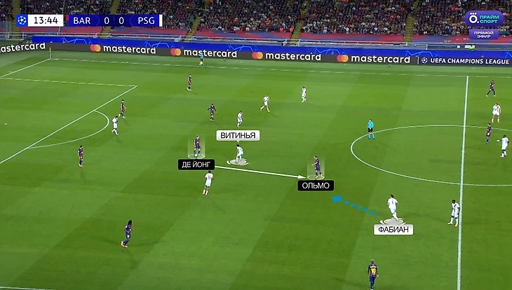 Даже в ситуациях, когда Шевалье все-таки находил короткий вариант (а если Торрес полностью переключается на вратаря, то кто-то из полевых «ПСЖ» точно окажется свободным), «Барса» грамотно переключалась и все равно возвращала себе мяч. Вот пример такой ситуации: Шевалье под прессингом находит спустившегося Фабиана, но де Йонг и Ольмо грамотно передают друг другу игроков и «ПСЖ» не удается выйти в атаку: