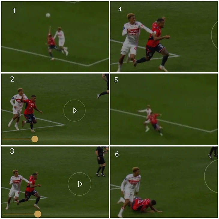 На фото 3-4 видно, что футболист армейцев крепко стоит на своих ногах, наш игрок возможно придерживает своего соперника рукой и небольшое касание ногой, это уже далеко от линии штрафной. (На фото 5-6 армеец начинает падать и приземляется на газон). Арбитр до ВАРа правильно назначил штрафной удар в нашу сторону.