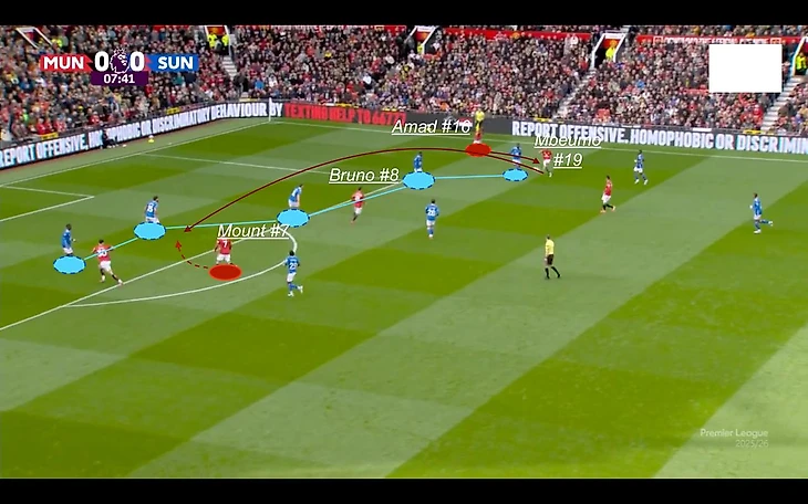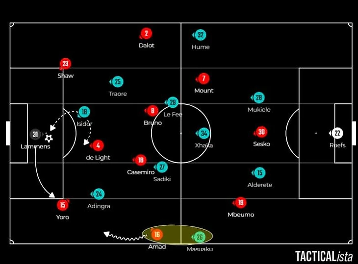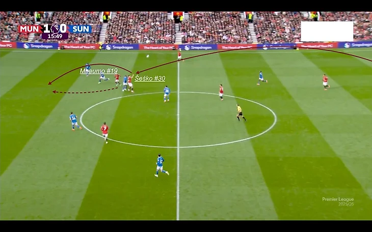Один из самых частых паттернов атак «МЮ» — длинный заброс от Ламменса. Шешко тянет за собой центрального защитника и продлевает мяч дальше, а Мбемо врывается в свободный коридор. Схема проста, но работает — точно так же команда вскрывала «Челси», когда удалился Роберт Санчес.