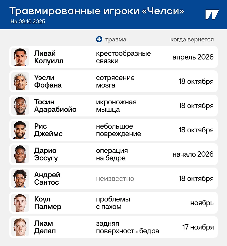 На пресс-конференции перед матчем против «Ливерпуля» тренер «Челси» Энцо Мареска обрисовал безрадостную ситуацию с составом – из-за повреждений и дисквалификаций были недоступны 8 игроков, включая Коула Палмера.