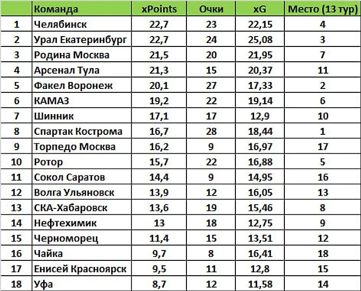 Составил для вас турнирную таблицу исходя из данных по xPoints. Таблицу, которая говорит о том, что у нас очень хороший вратарь. Об этом мы недавно говорили, нужно набрать аж 2,6 xG, чтобы пробить Чагрова (второй Селихов 2.09). И таблицу, которая считает, что на данном этапе «Ротор» в хороших отношениях с фортуной: +6 после 13 туров и 10 место по ожидаемым очкам. Но ведь без везения в нашем деле никуда, не правда ли? Тут ничего личного, просто цифры.
