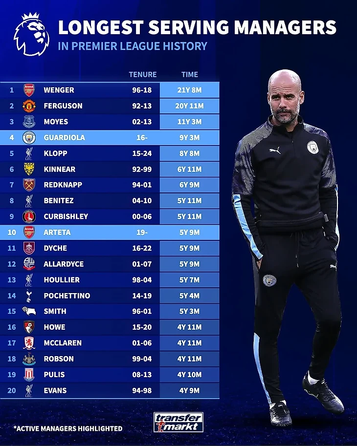 Transfermarkt выкатил таблицу, состоящую из двадцати самых длительных тренерских работ за время существования АПЛ.