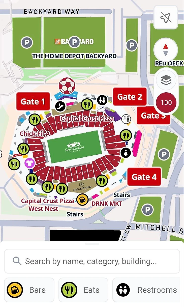 На основе этого AI строит оптимальные маршруты, показывая наименее загруженные туалеты, бары с короткими очередями и быстрые пути к вашему сектору.