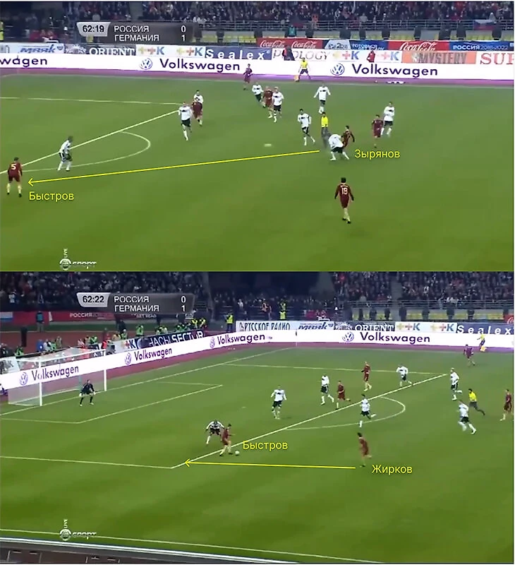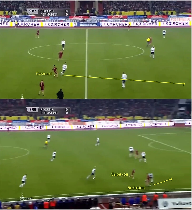 И разыгрывал в глубине как правый опорник. Тут Игорь классно разбил прессинг проникающей передачей направо, а Быстров изумительно подыграл пяткой на ход Зырянову.
