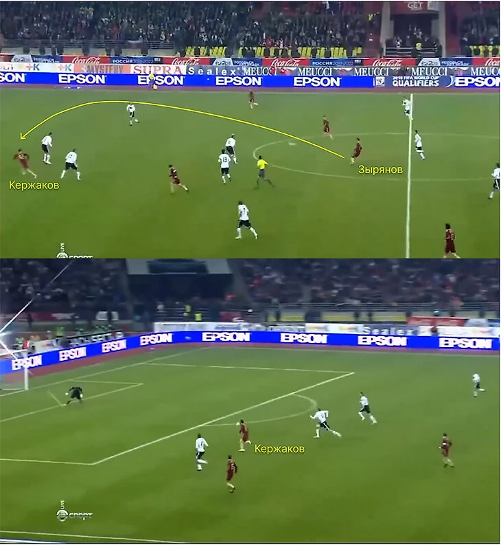 По сути, это современный футбол. Ложный вингер отскакивает в середину и формирует четверку полузащитников, освобождая фланг для подключений атакующего левого защитника. Десятка свободно ищет мячи. В центре поля игроки не привязаны к позициям, хаотично передвигаются и примеряют на себя роли глубинных плеймейкеров и адресатов между линиями. Даже крайние защитники чересчур похожи на современных. В первом тайме Россия использовала асимметричные фланги: Жирков заполнял зону высоко на фланге, а Александр Анюков оставался ниже.