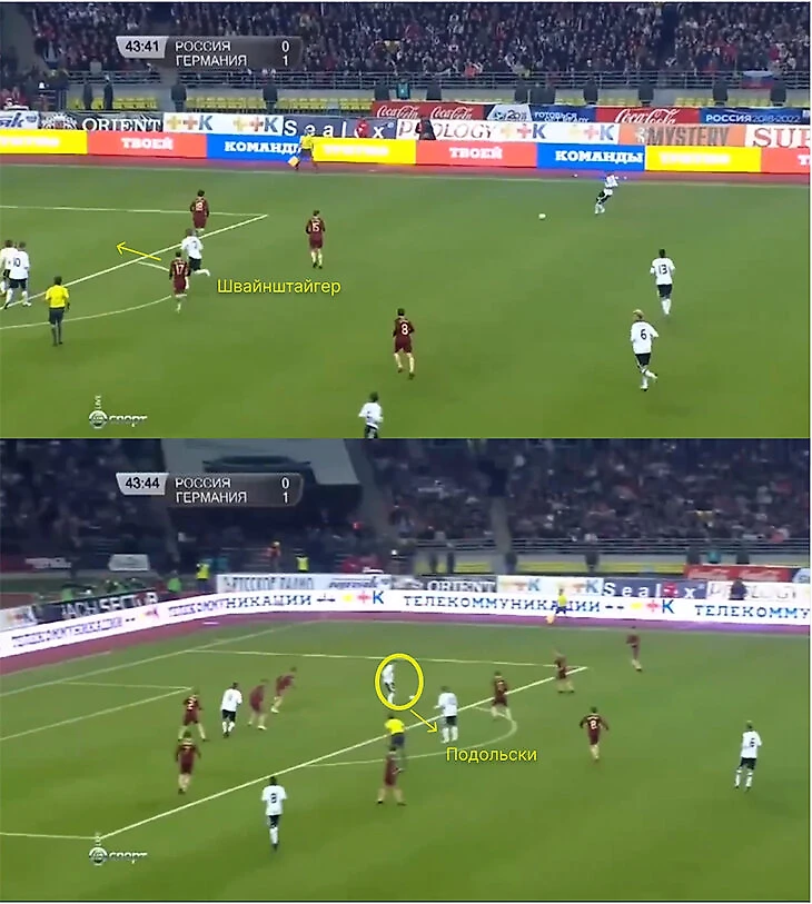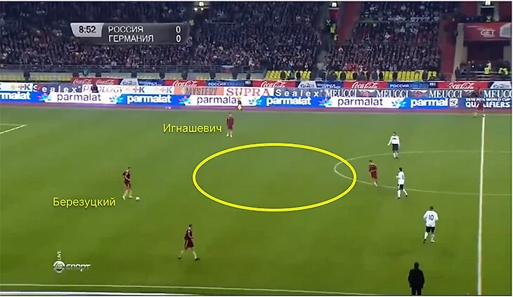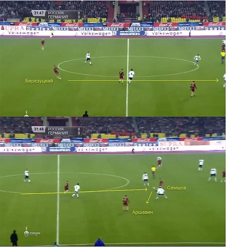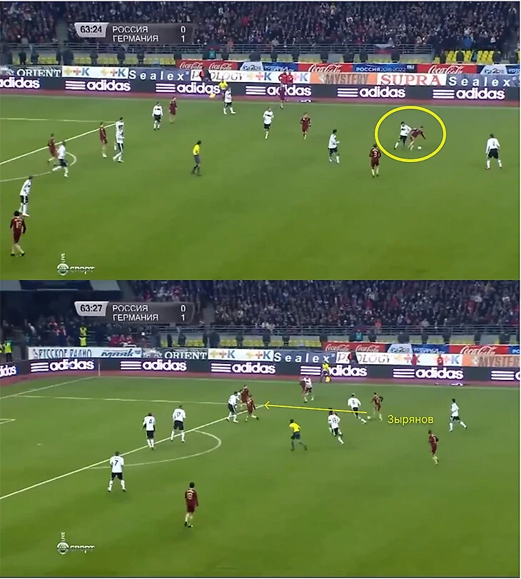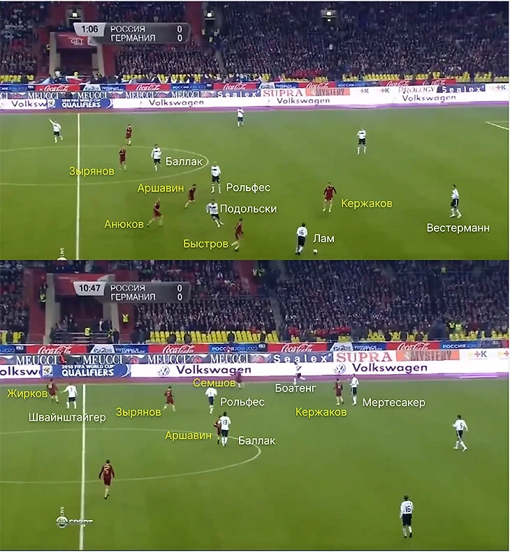 Тут Басти открылся в полуфланге и продвинул атаку на чужую треть. Игроки сборной России заняты прямыми оппонентами и не встречают. Например, на втором скрине Аршавин не смещается к немцу, а контролирует центральную ось, Зырянов спиной к мячу и следит за движением Баллака.