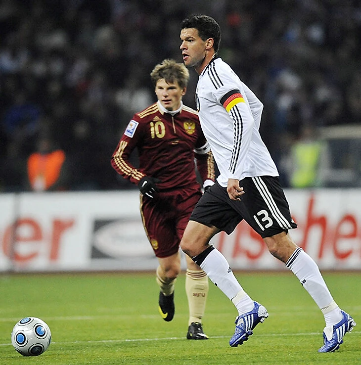 Хиддинк сковал Германию персоналкой и вязким средним блоком. Вингеры встречали крайних защитников в момент приема. Аршавин прикрывал опорника Симона Рольфеса (возможно, выход полузащитника «Арсенала» в центре – попытка Хиддинка разгрузить лидера сборной в обороне). Константин Зырянов подхватывал Михаэля Баллака. Кержаков отскакивал к ближайшему центральному защитнику. А крайние защитники следили за спусками Швайнштайгера и Подольского. Выглядело очень плотно.