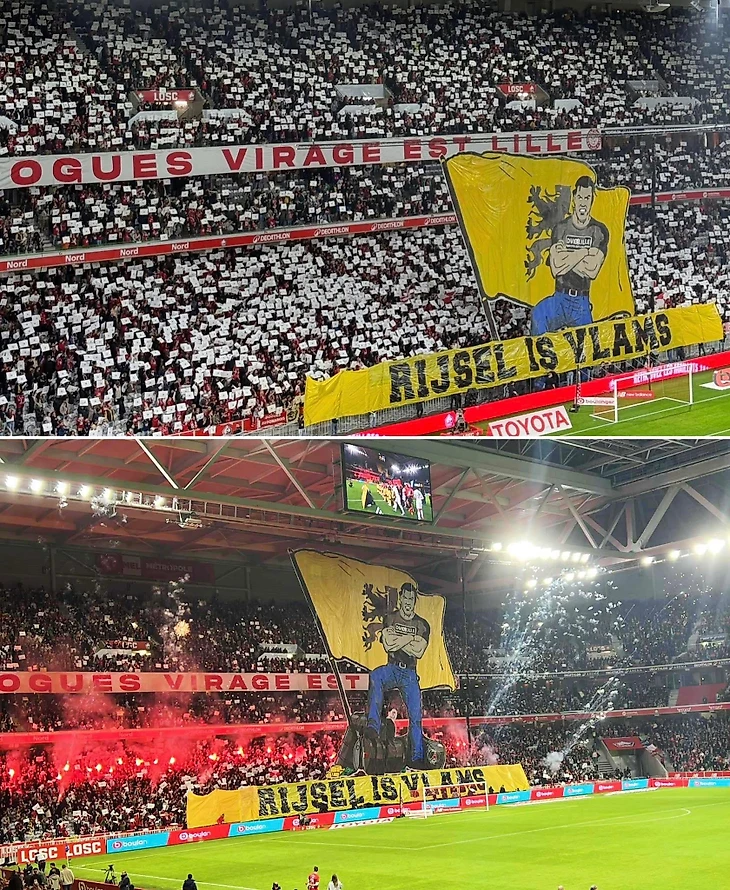 Встреча развивается непросто для обоих коллективов, на восточной трибуне, которую занимают Dogues Virage Est, появляется тифо с сильным и уверенным мужчиной. Под его ногами нефтяные бочки, деньги, символизирующие проект парижского клуба, за его спиной флаг Фландрии, в самом низу надпись: «Лилль — фламандский». Фландрия — земля, исторически находившаяся на территории современных Бельгии, Франции, Нидерландов, на которой проживал отдельный народ со своим языком — фламандцы, составляющие сегодня огромную массу бельгийского населения. Большая часть земель располагается в Бельгии, во Франции частью исторической Фландрии является департамент Нор, с центром в Лилле. На родине Эдена Азара активно развиваются фламандские националистические движения, символом которых является полностью черный Лев Фландрии. Именно эта деталь в перфомансе DVE и зацепила многих, ведь на официальном гебре Бельгийской Фландрии когти и язык льва красного цвета. Президент Dogues Virage Est комментирует ситуацию так: