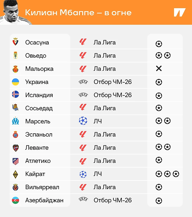⚽️ Мбаппе забивает в 10 матчах подряд – и это личный рекорд. Выстояла только «Мальорка», но даже там француз забил два из офсайдов. Все остальные страдают, остановить форварда не смог даже «Атлетико».
