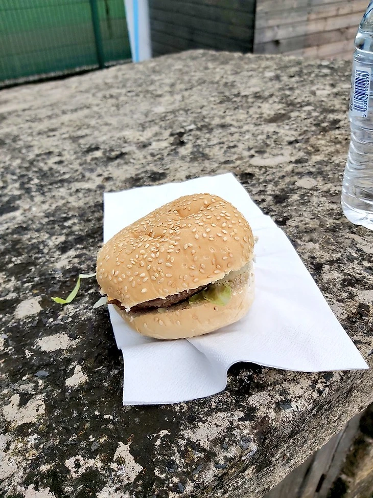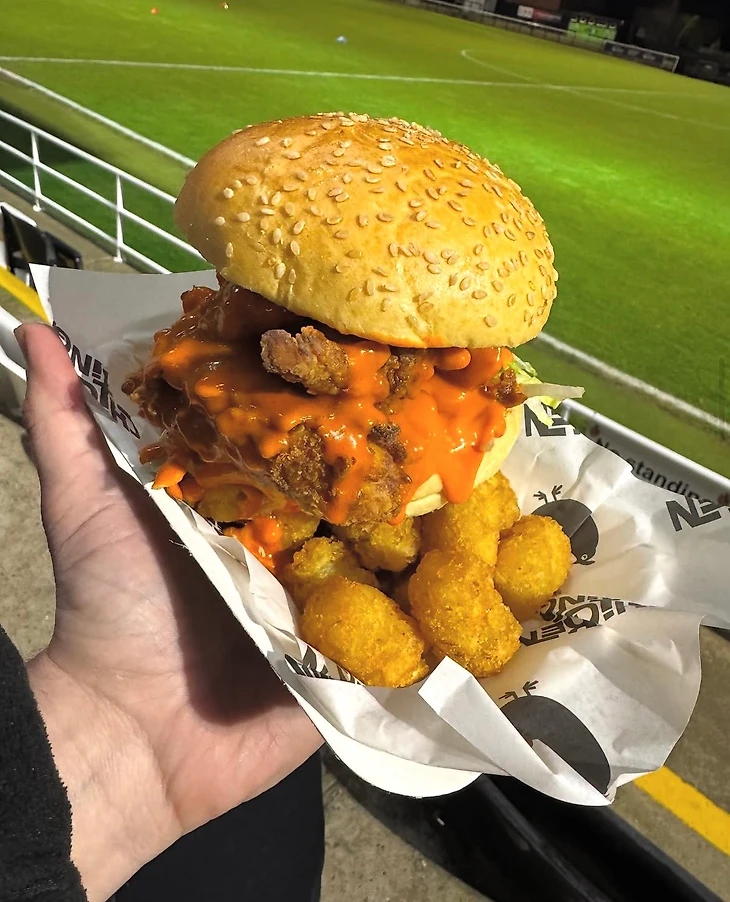 На стадионе работает палатка, где продают шикарные куриные бургеры по 10,00 фунтов (~1110 рублей) и пивасик по 4,00 фунта (~443 рубля).