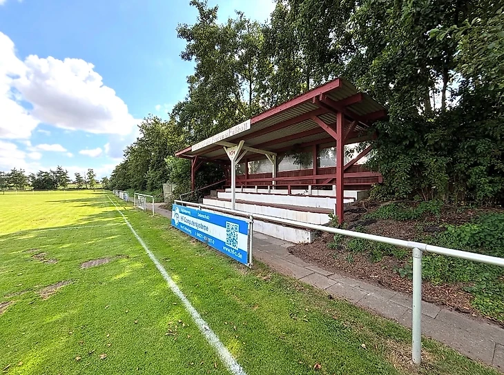 С одной стороны поля расположена деревянная трибуна, разделенная на три секции, одна из которых оборудована сиденьями.