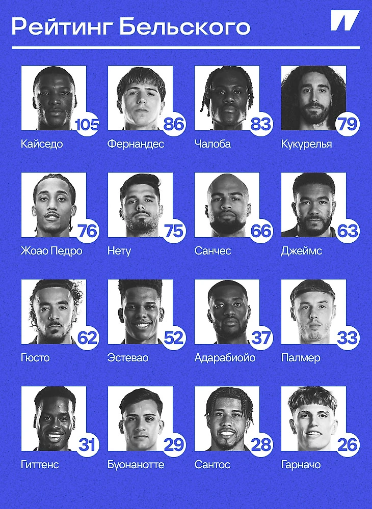 Радует появление Риса Джеймса так высоко. Будем надеяться, что травмы остались позади. 52 балла у Эстевао, который среди всех вингеров явно выделяется креативом и яркими эпизодами. Из крайних нападающих выше только Педру Нету (75), который трудится не только в атаке, но и здорово работает без мяча.