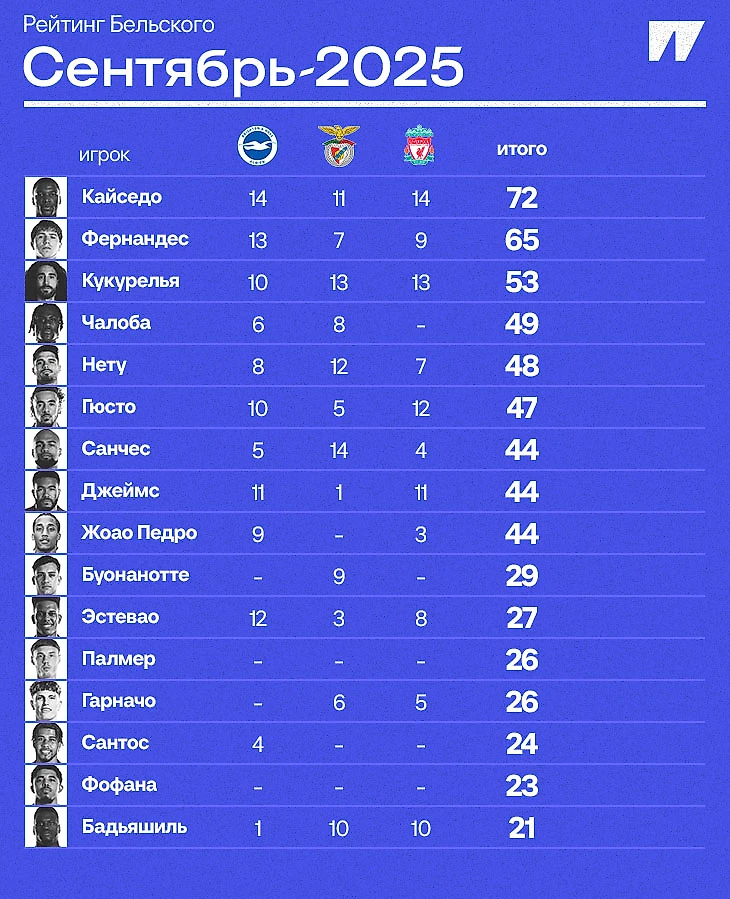 Всего два игрока появились во всех семи матчах: это Энцо Фернандес и Педру Нету. Аргентинец во всех выходил в старте, что помогло ему набрать 63 балла и уверенно забрать вторую строчку. Но первый снова (как и в прошлом сезоне почти всегда) Мойсес Кайседо, отметившийся голами против «Брентфорда» и «Ливерпуля». Оба мяча на загляденье, оба важные. Мои главное действующее лицо этого «Челси», тем более в отсутствии Коула Палмера, который после матча с «МЮ» только и лечится.
