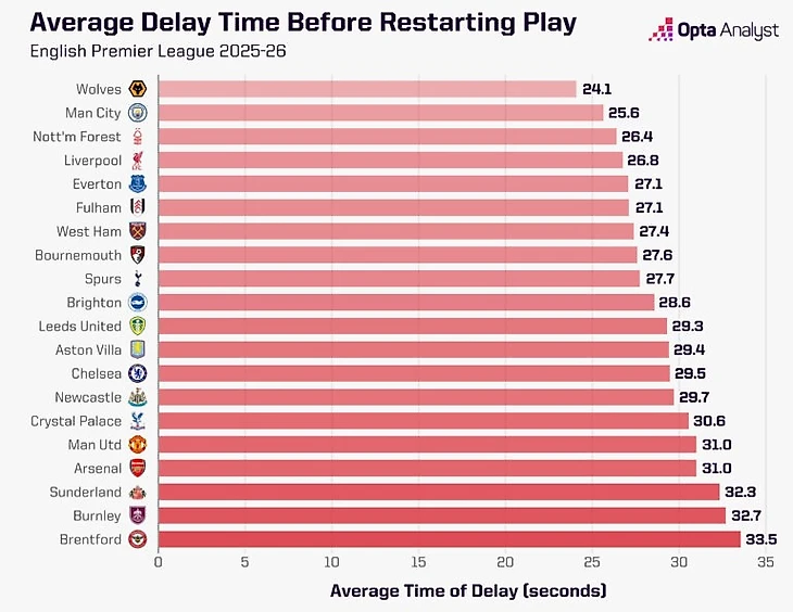 Если учитывать все виды задержек, то именно «Брентфорд» проводит больше всего времени, возвращая мяч в игру — в среднем 33,5 секунды на каждое возобновление.