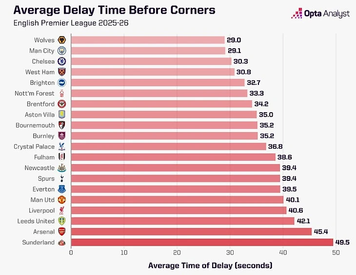 Многие, вероятно, ожидали увидеть «Арсенал» во главе этого списка: в прошлом сезоне «канониры» действительно лидировали по задержкам при подаче угловых, в среднем тратя чуть меньше 44 секунд.