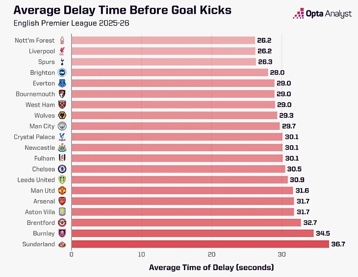 Если говорить о цифрах, то «Кристал Пэлас» (41,6 секунды) и «Брентфорд» (41,0 секунды) тратят больше всех времени в среднем на исполнение штрафных ударов, тогда как «Фулхэм» (25,8 секунды), «Брайтон» (26,8 секунды) и «Ливерпуль» (26,9 секунды) делают это быстрее всех.